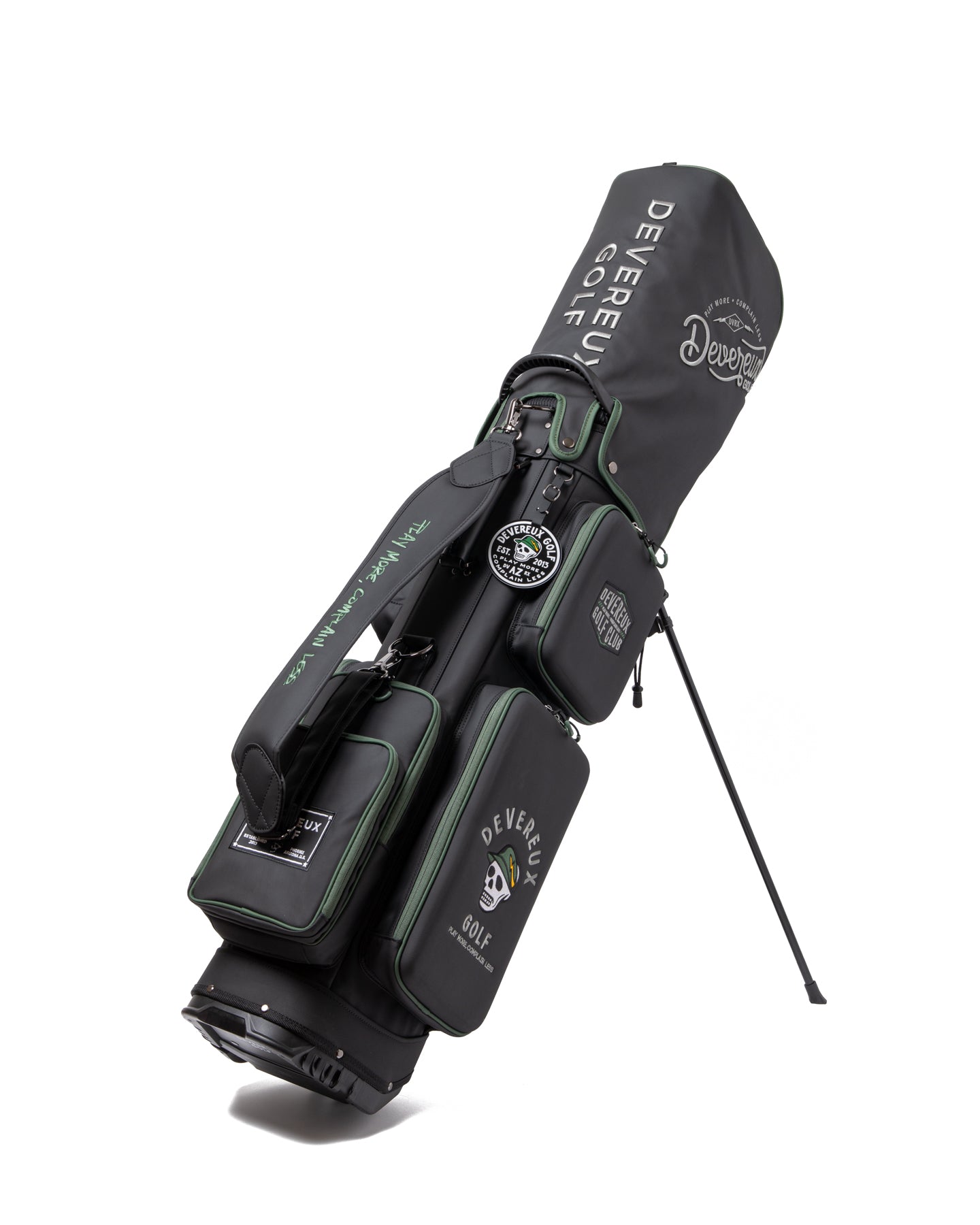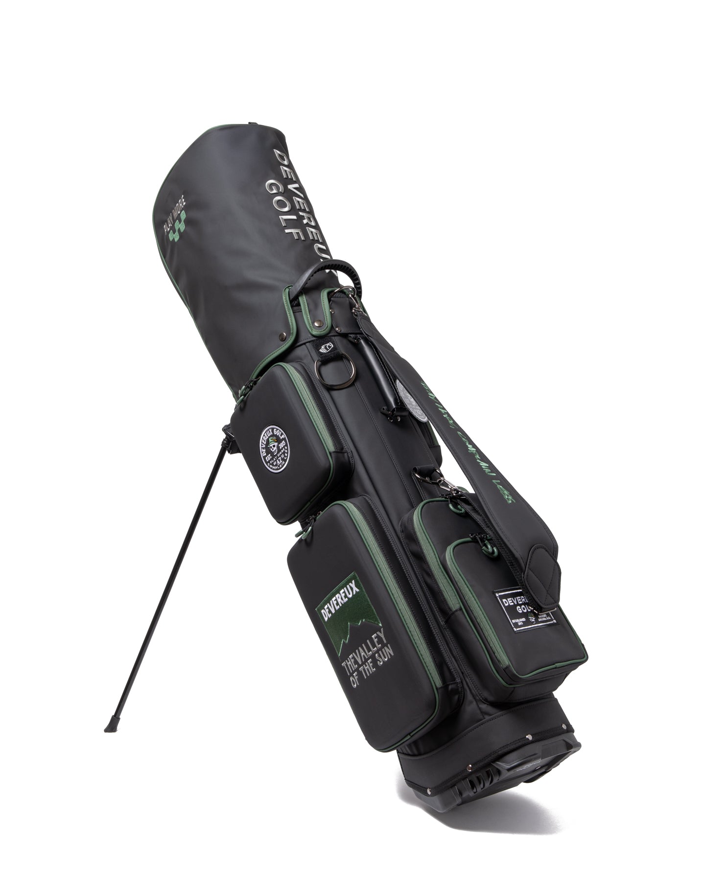 底面にはDEVEREUX GOLFのロゴを配置。担いだ際やスタンド使用時にもさりげなくブランドロゴが目に入り、細部にまでこだわったデザインが印象を高めます。