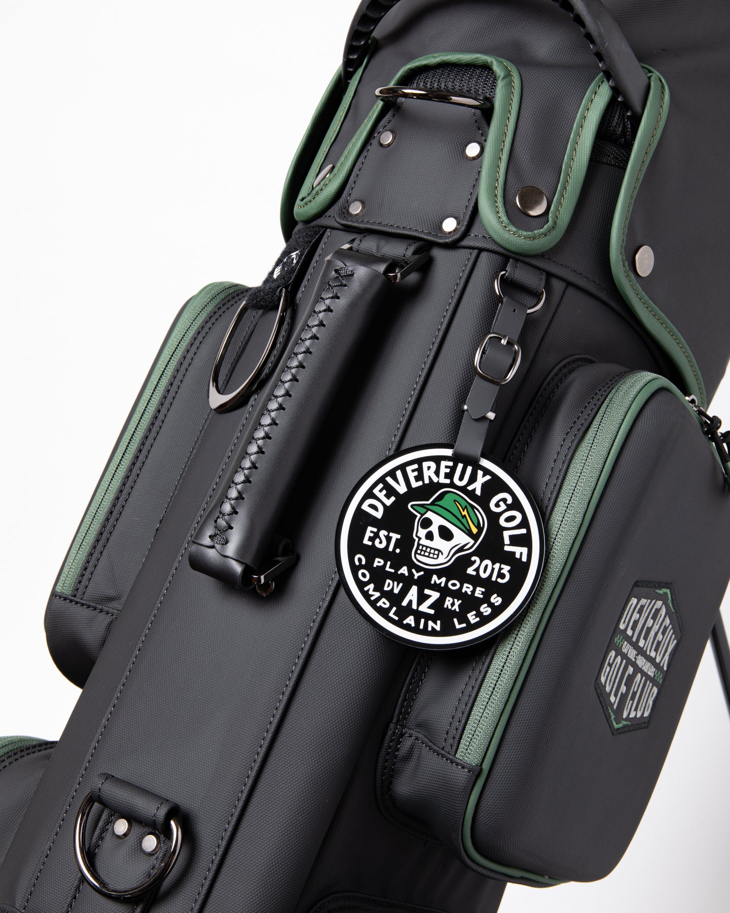 DEVEREUXのアイコンであるスカルキャディーが際立つ、オリジナルデザインのネームプレート付き。持ち運びやすく高級感のある、しっかりとしたハンドルを採用。