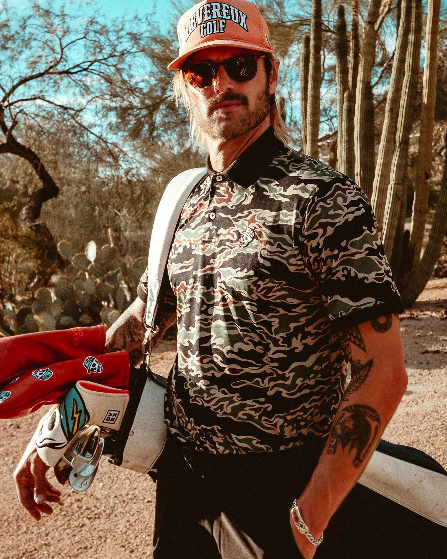 年中活躍できるクラシックアメリカンゴルフにDEVEREUX GOLFのアリゾナをイメージしたカモフラージュ柄がマッチしたポロシャツ。吸汗速乾機能付きで快適にプレイできます。