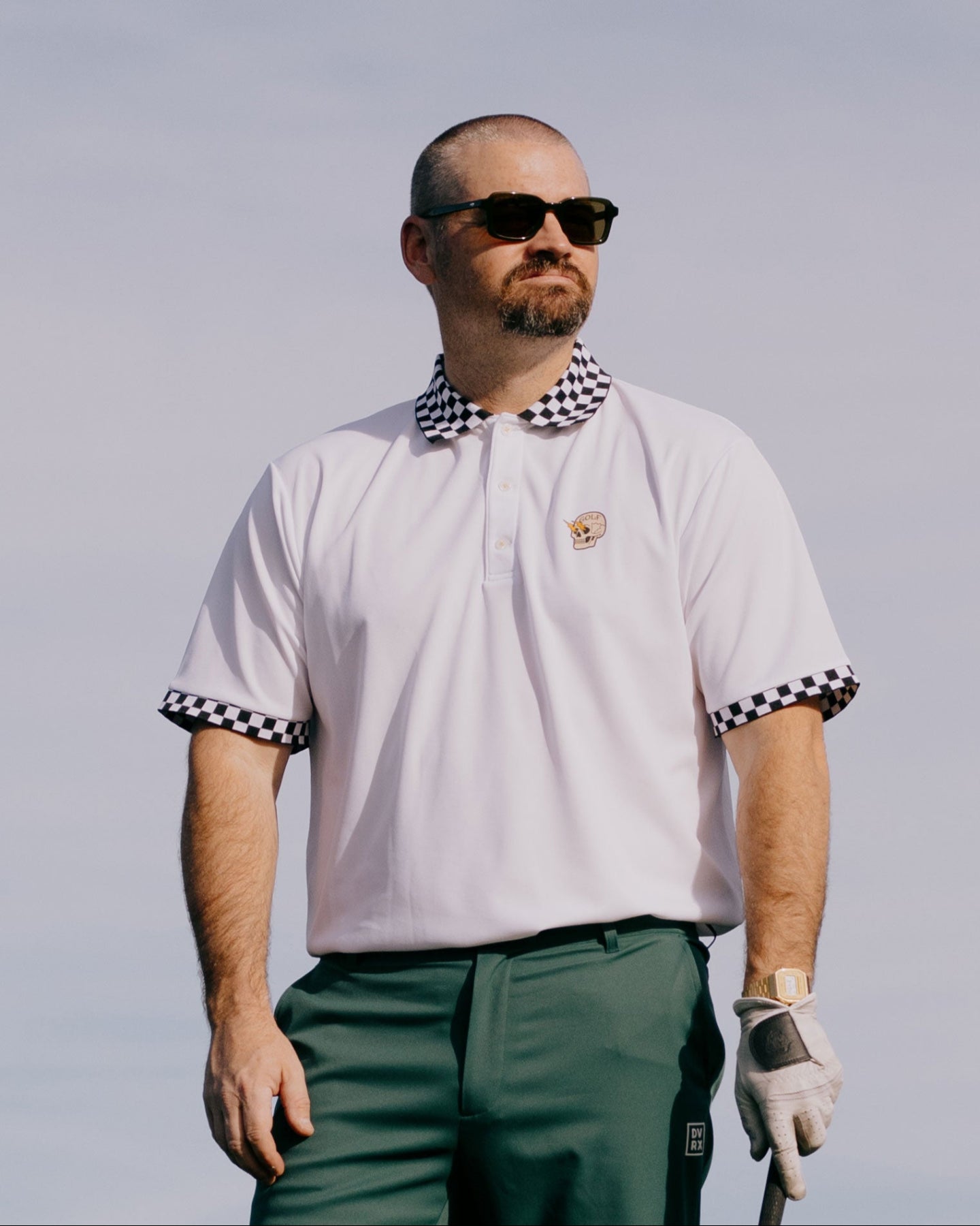 バックグラフィックにCafe RacerシリーズのShocker Skullロゴがプリントされたポロシャツ。