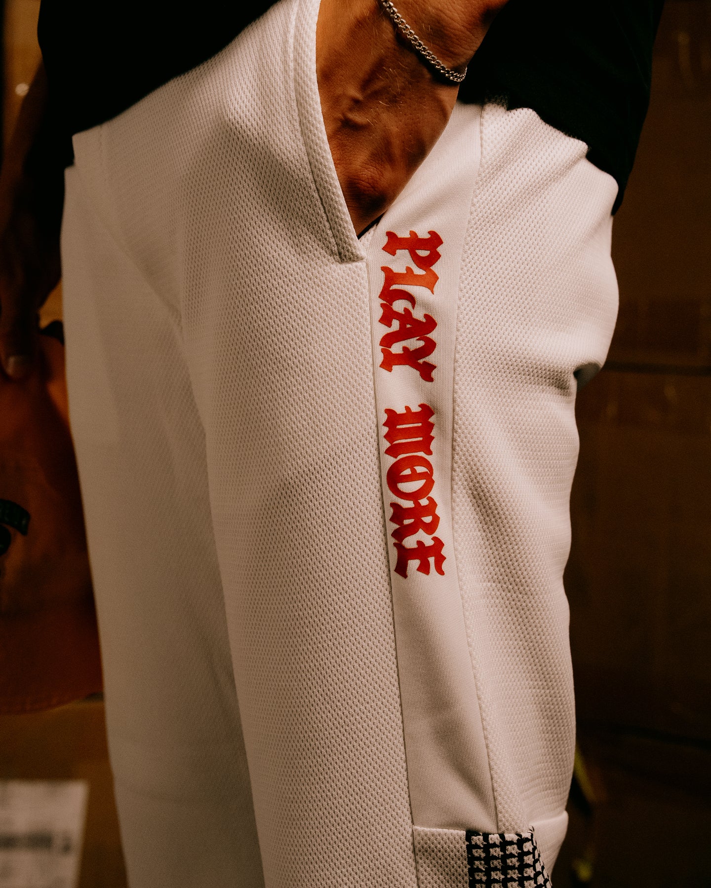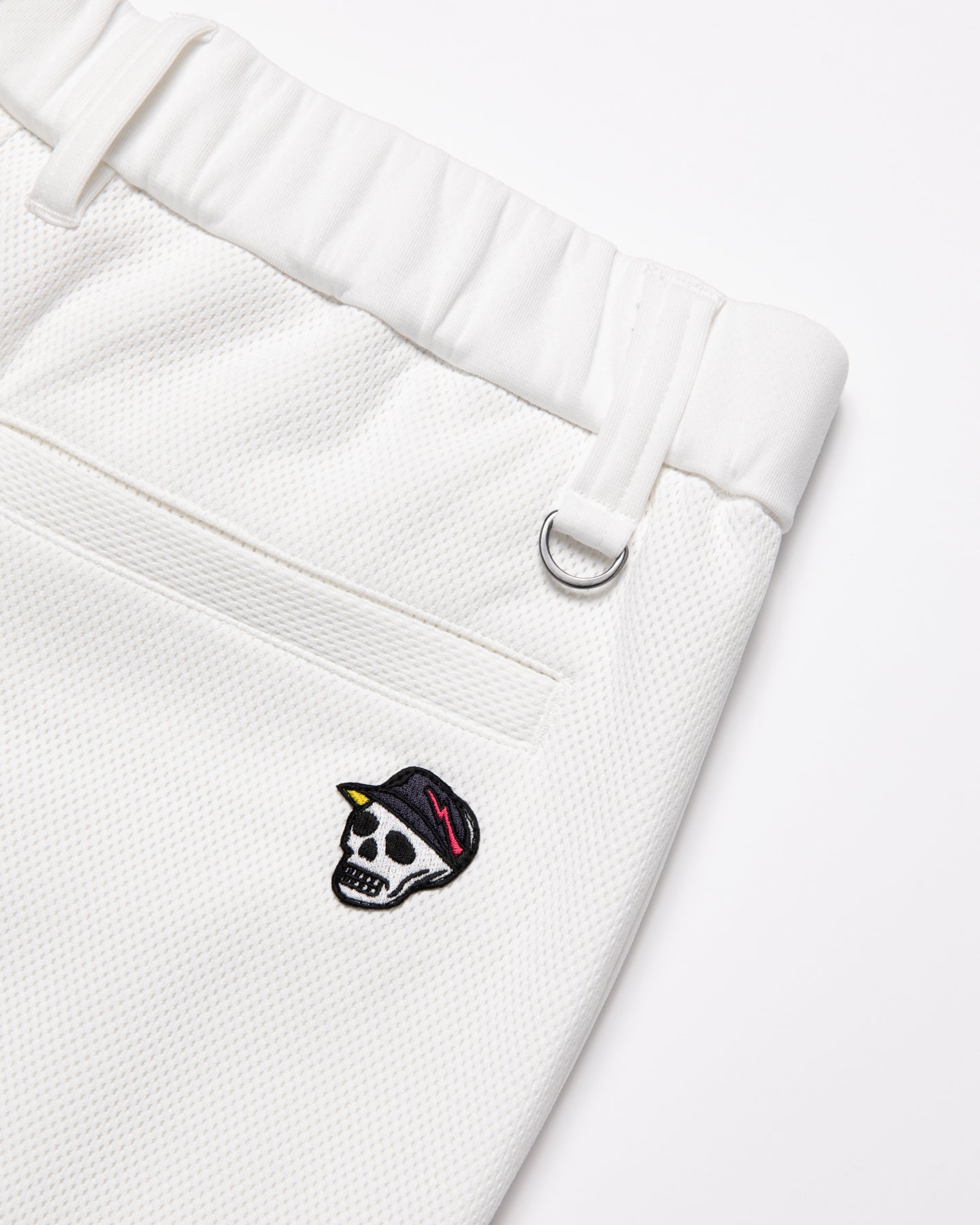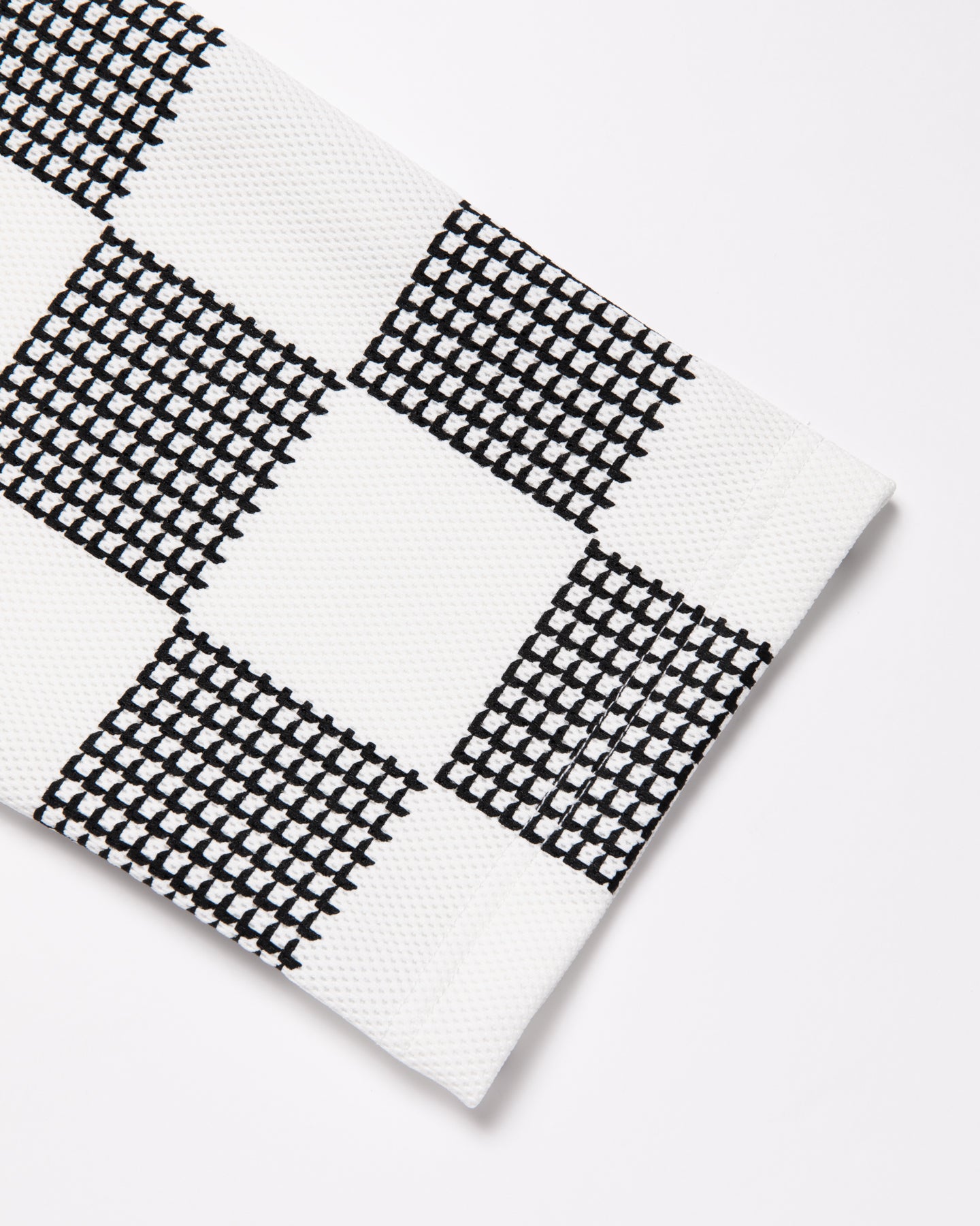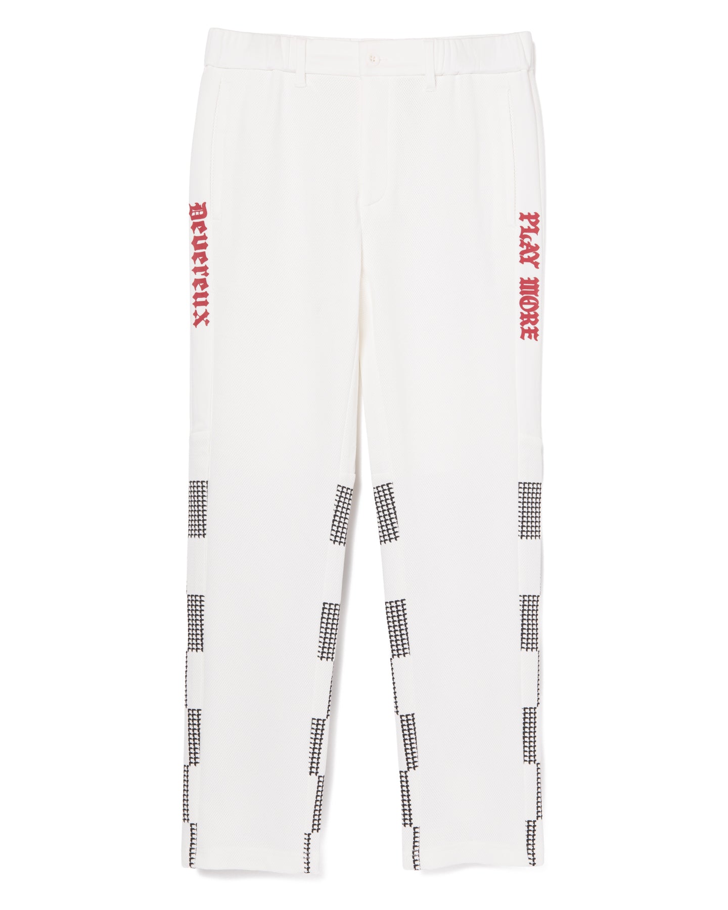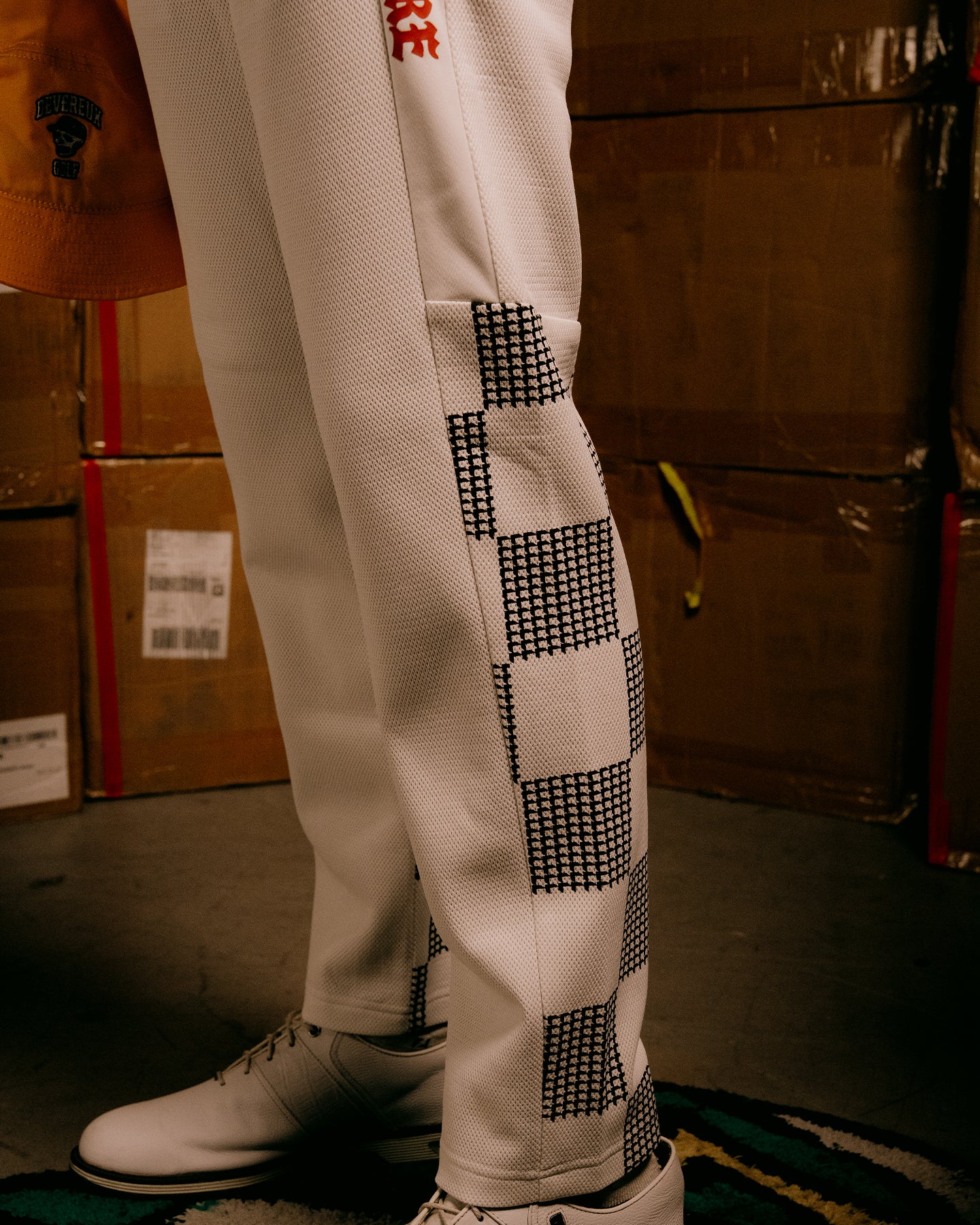 大好評の“CAFE RACER”アイコンであるチェッカーフラッグを大胆に取り入れた、セットアップ可能なロングパンツです。チェック柄はラッセル編みで表現しており、希少性の高い仕上がり。同じシリーズのジャケットと合わせてセットアップで着用すれば、ゴルフ場でも注目を集める一着です。