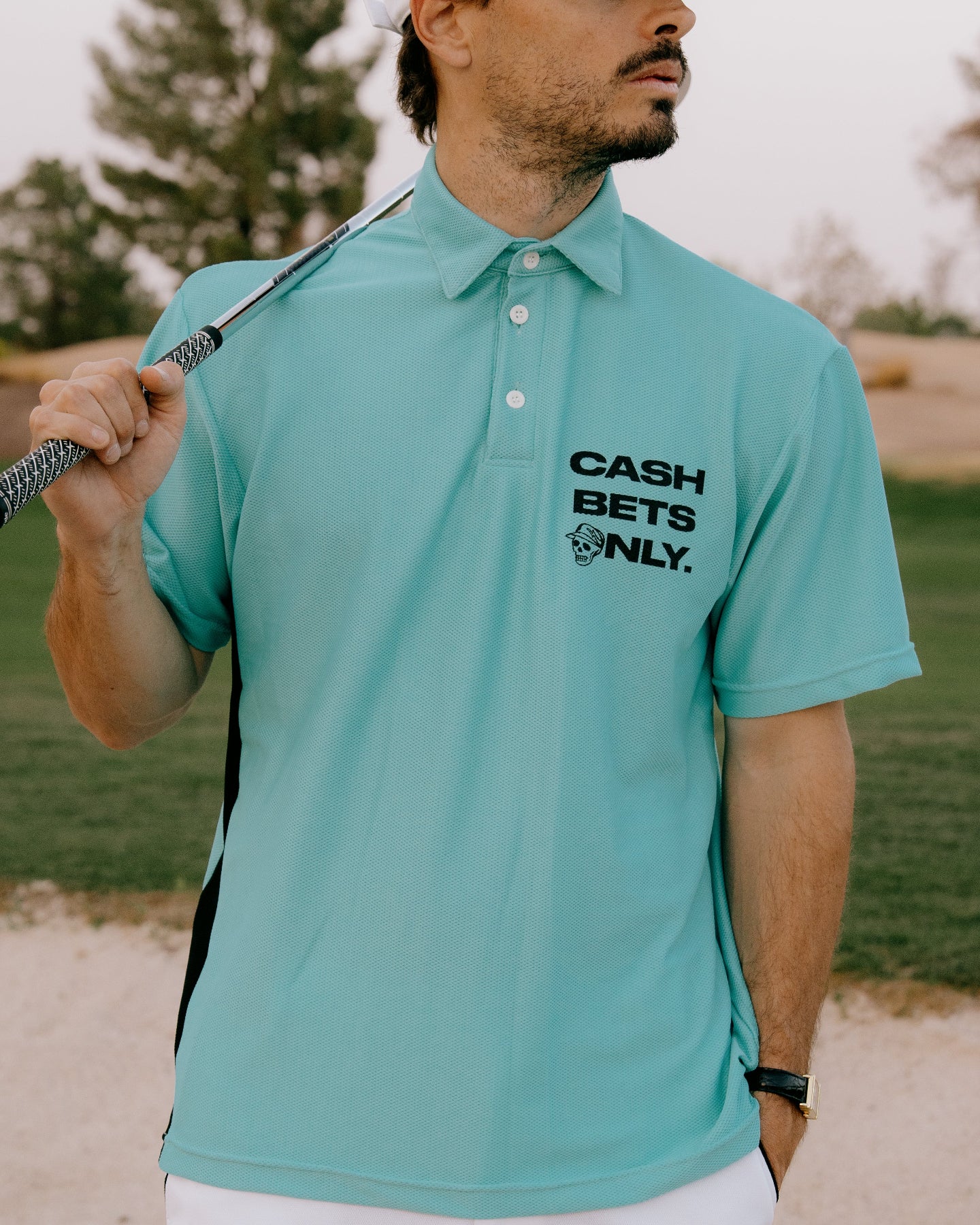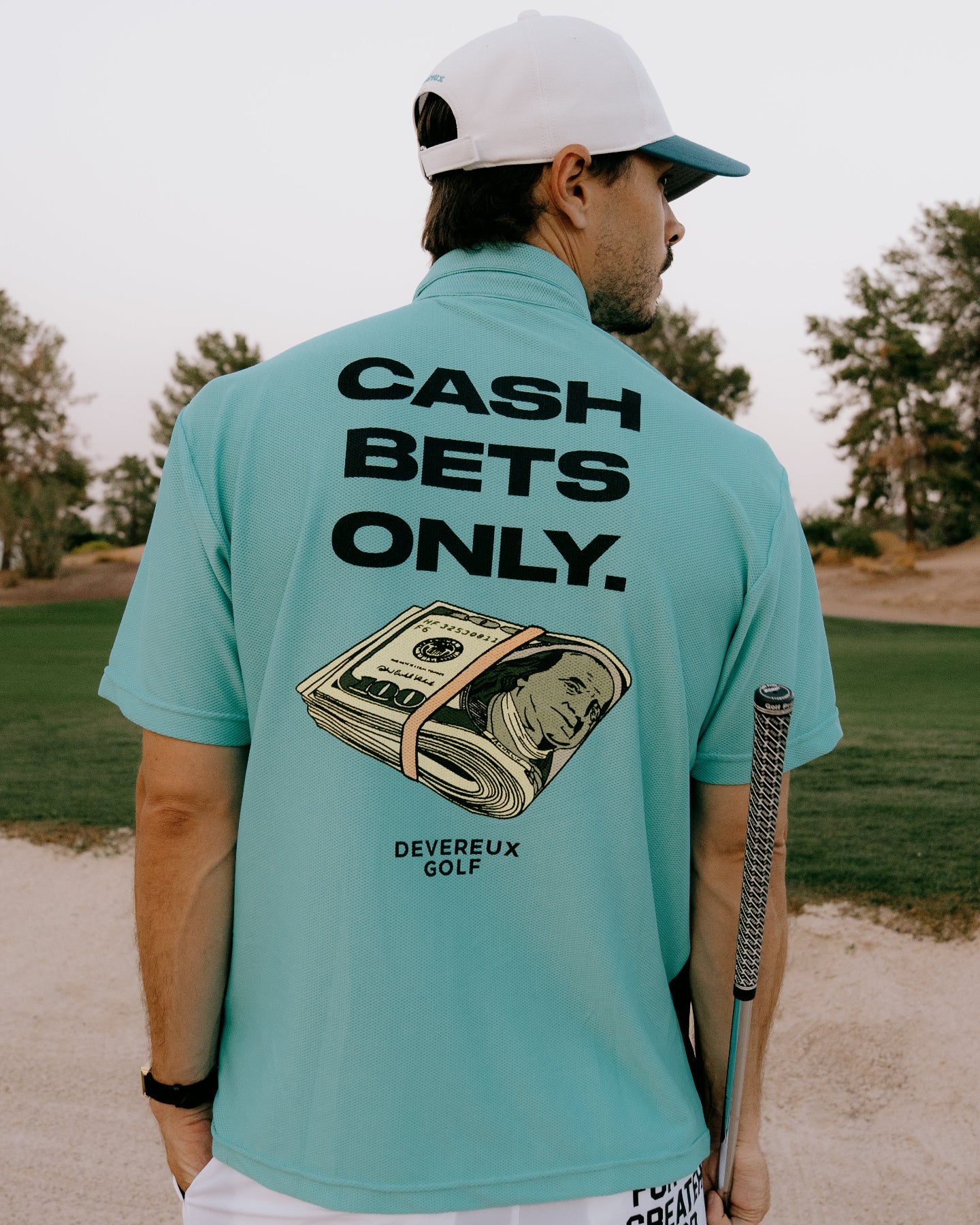 吸湿速乾性、UVカット機能、優れたストレッチ性を備えた素材を使用したポロシャツ。脇には配色切り替えデザインを施し、背面には昨シーズンNo.1の販売実績を誇る「Cash Bets Only」のアートをプリントした、注目の一着です。