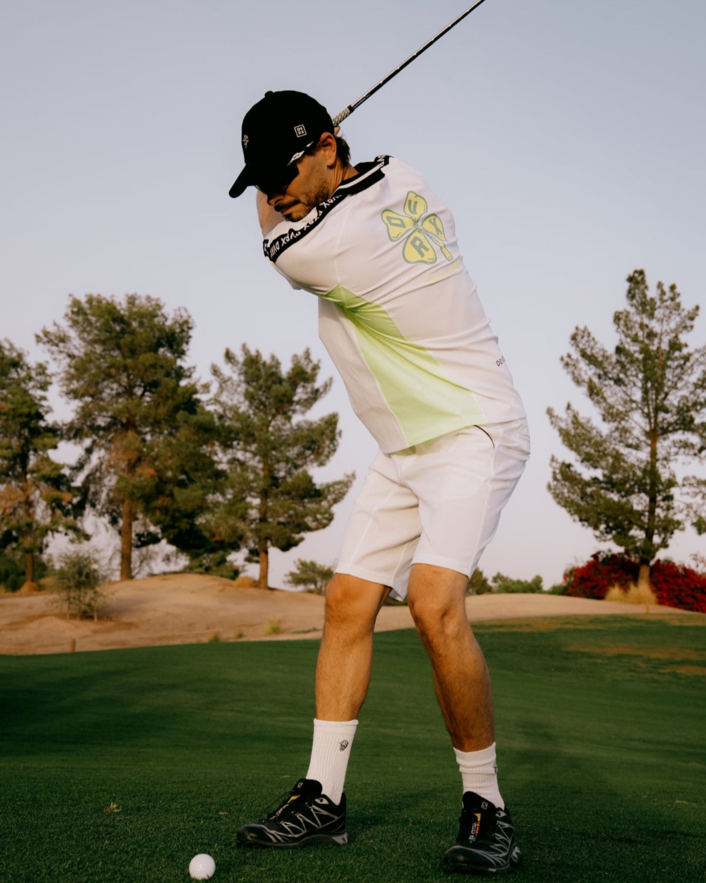 表面感のあるナイロンPU素材を使用し、袖下と脇部分には異素材としてナイロンPUポプリンを組み合わせたハーフジップポロ。肩から袖にかけてあしらわれたロゴ入りリブテープがアクセントになっており、背面にはグラフィックアートのプリントを配置。さらに、立体的な3D裁断により、快適な着心地を実現しています。