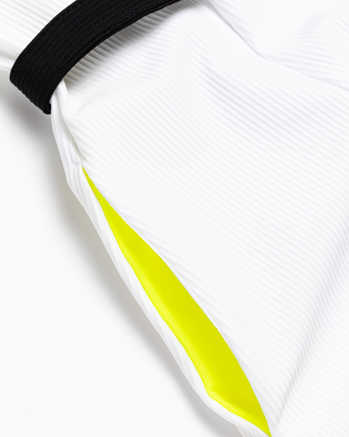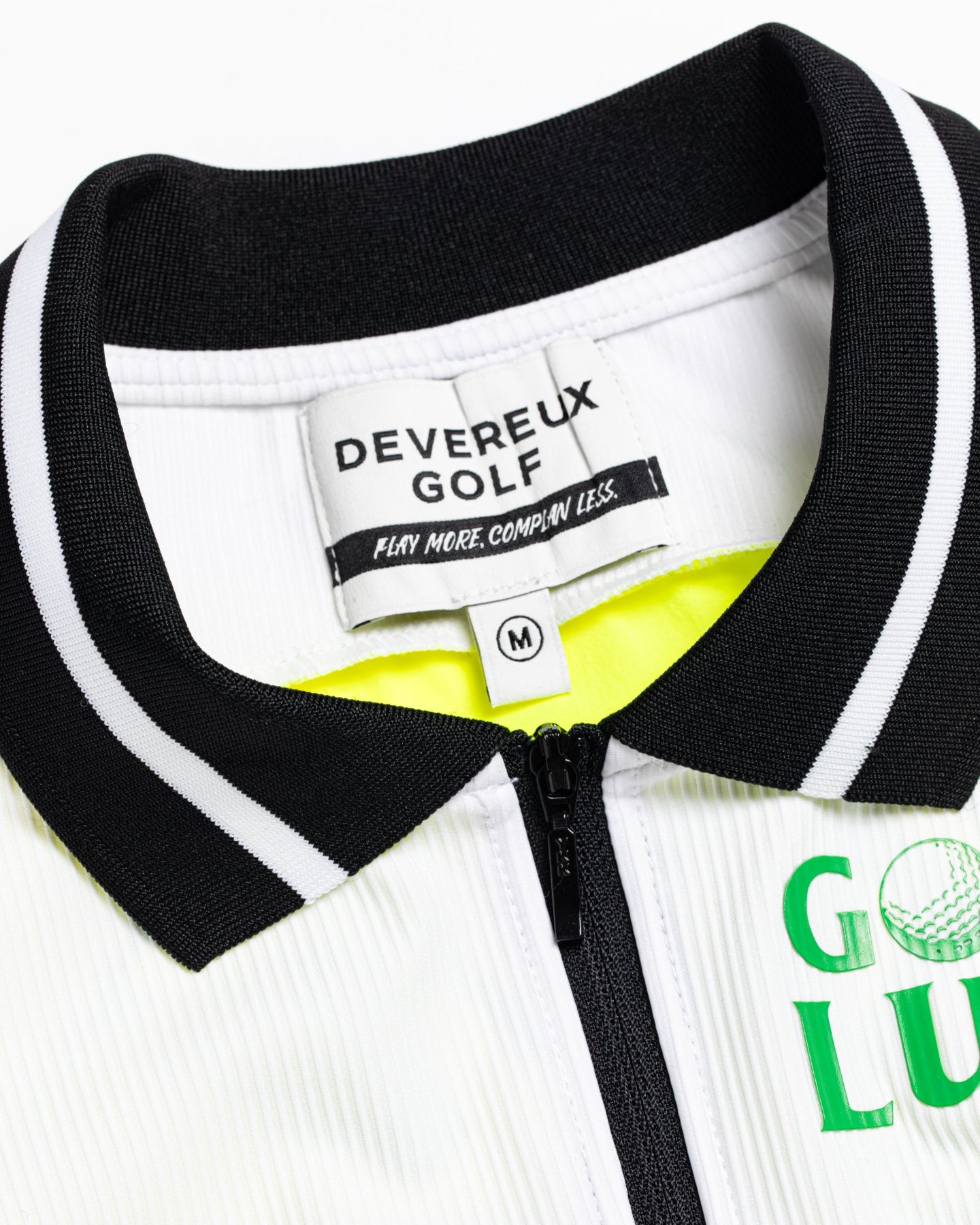 表面感のあるナイロンPU素材と、背中部分にナイロンPUポプリンの別布を使用したハーフジップのノースリーブドレス。肩にあしらわれたロゴ入りリブテープがアクセントになり、背面のグラフィックアートと立体的な3D裁断により、快適な着心地とデザイン性を兼ね備えた一着です。