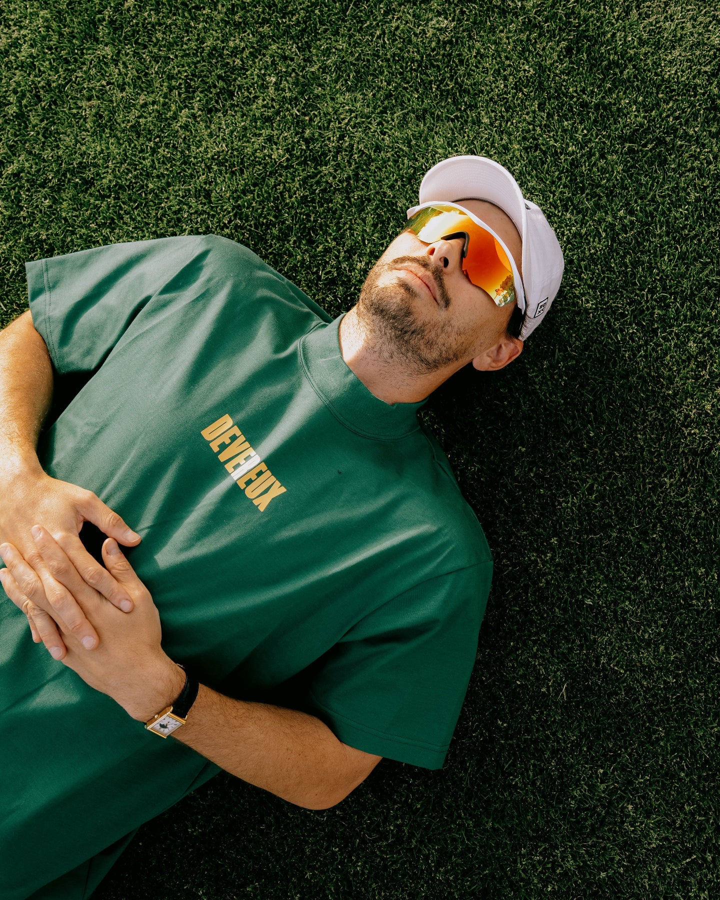 超ハイゲージで編み立てた綿100%半袖スリーブモックネックTシャツ。バックにアソートされたDEVEREUXオリジナルグラフィックの数々をプリントしたDEVEREUXライフスタイル人気アイテム。