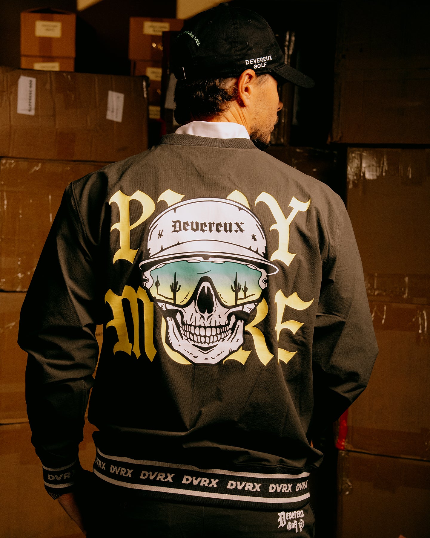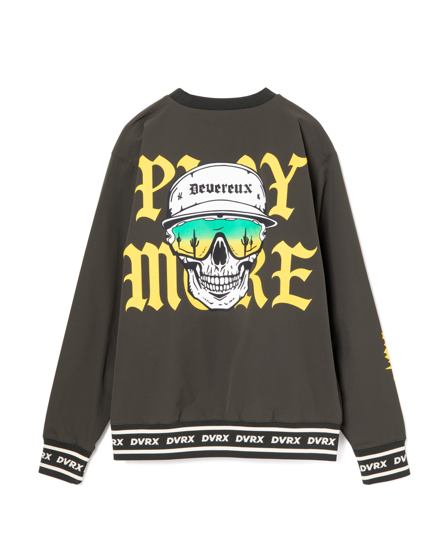 タフなコーデュラ素材にストレッチ性をプラスし、DEVEREUXらしいファブリックを使用したプルオーバー。背面にはクールな“Dead Man”のプリントを施し、落ち着いたボディカラーに鮮やかな発色が映えるデザインに仕上げました。秋冬のコーディネートにアクセントを加え、ゴルフをより楽しめる一着です。