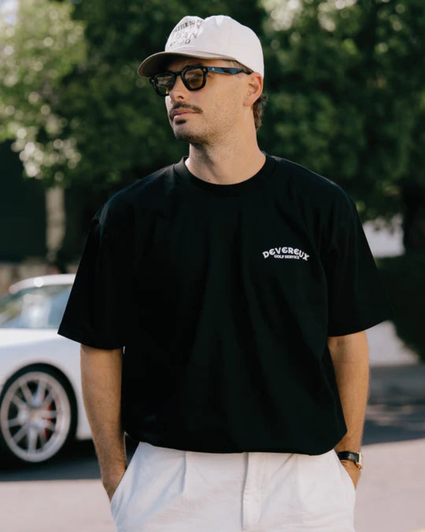 フロントには大胆でグラフィックなデザインを、背面には架空の「Devereux Golf Cart Services」を日焼けしたような風合いで表現。アリゾナらしい砂漠の空気感を漂わせ、着るたびにクリエイティブなルーツを感じさせてくれます。丈夫な素材とタイムレスなデザインで、長く愛用できるTシャツです。