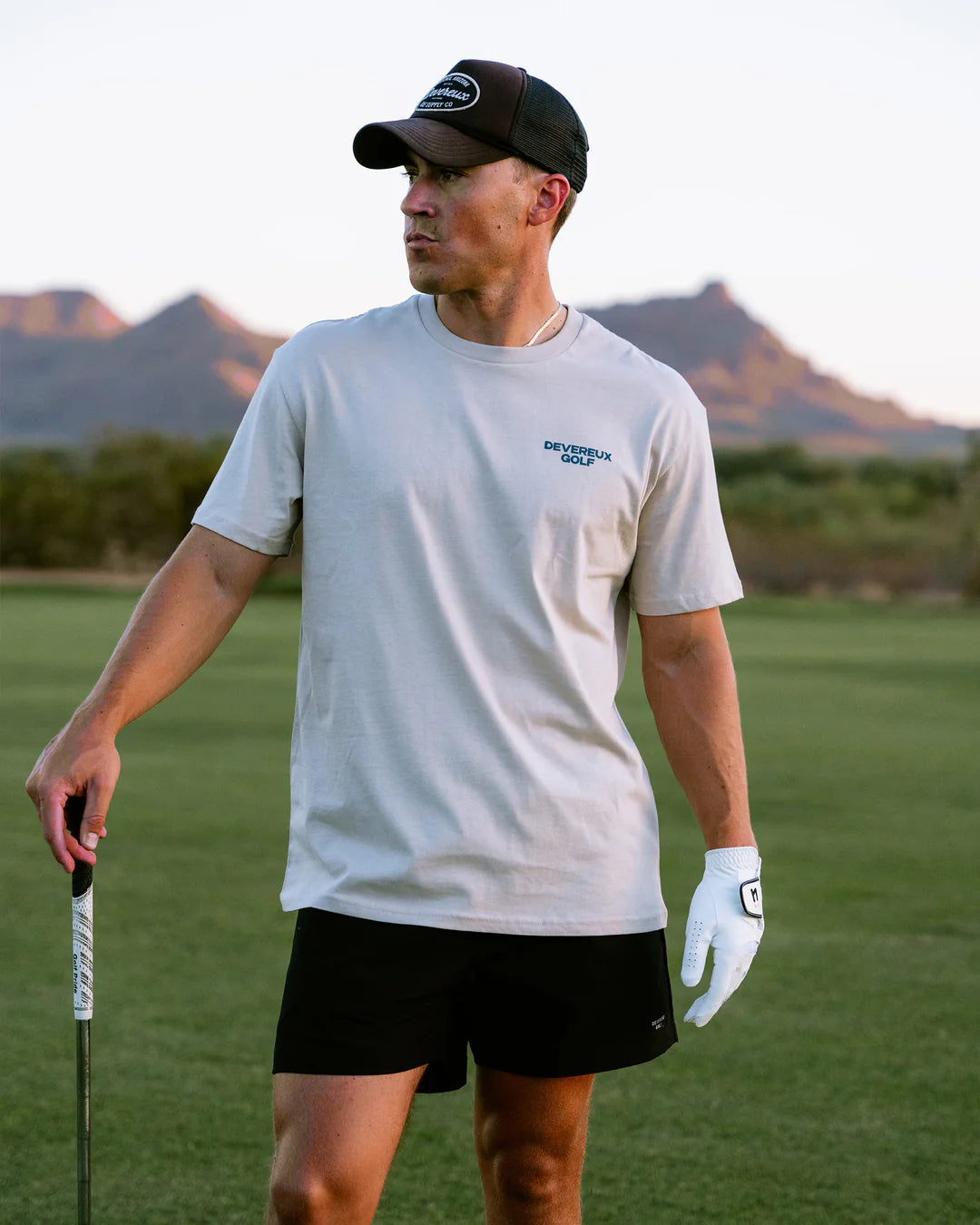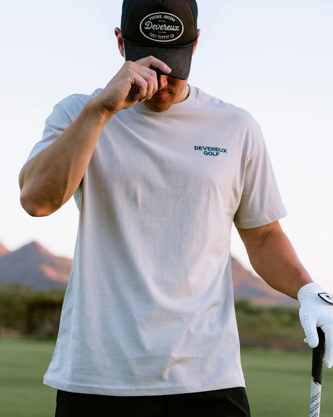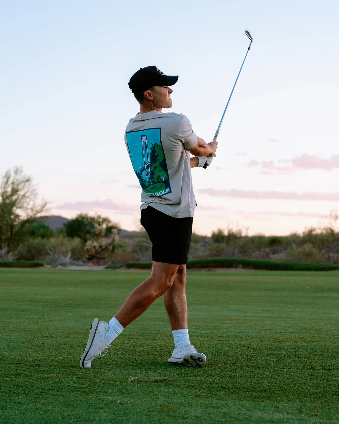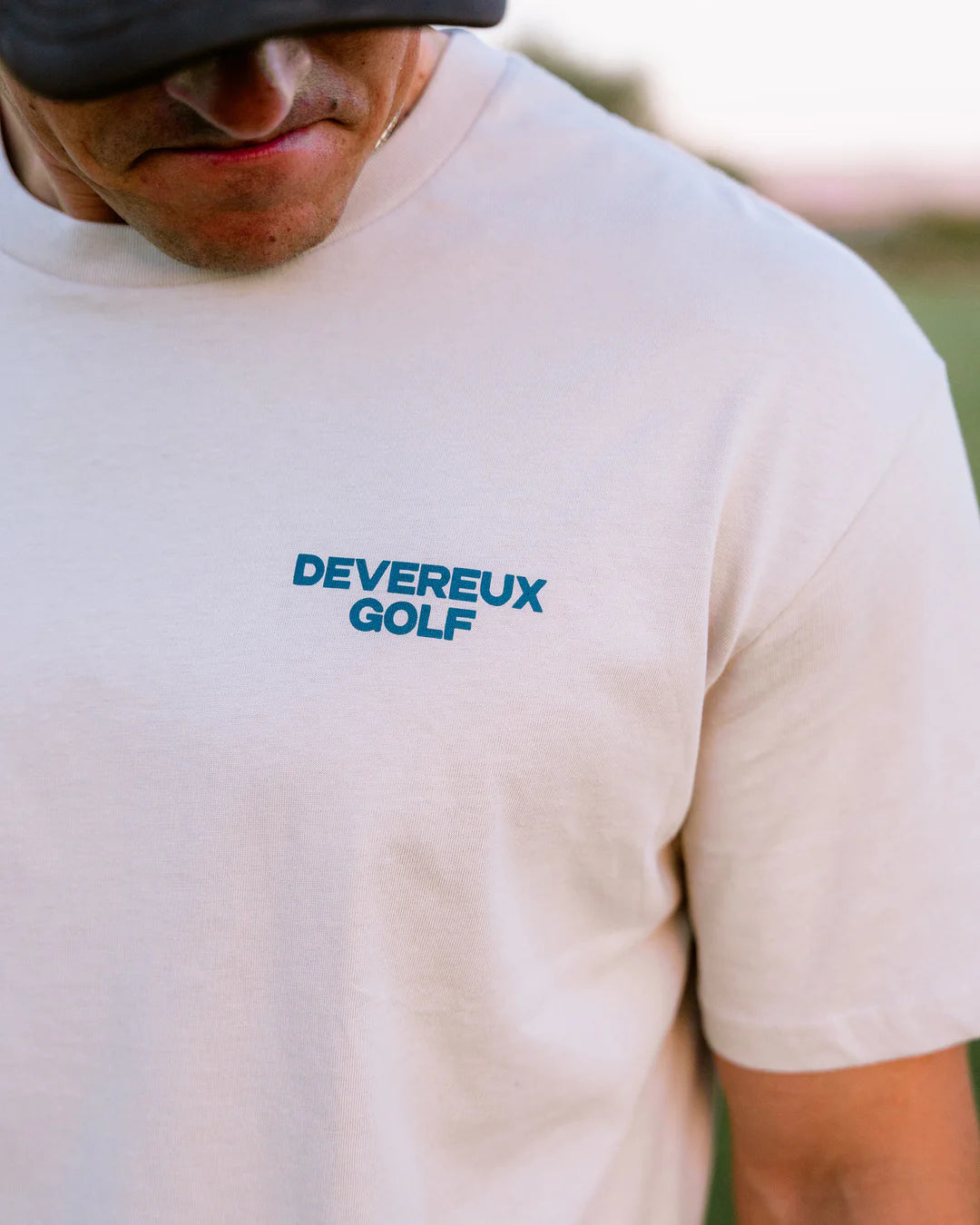都会的なボーンカラーを基調に、胸と背中に施したプリントが“都市のエネルギー×ゴルフカルチャー”を表現。