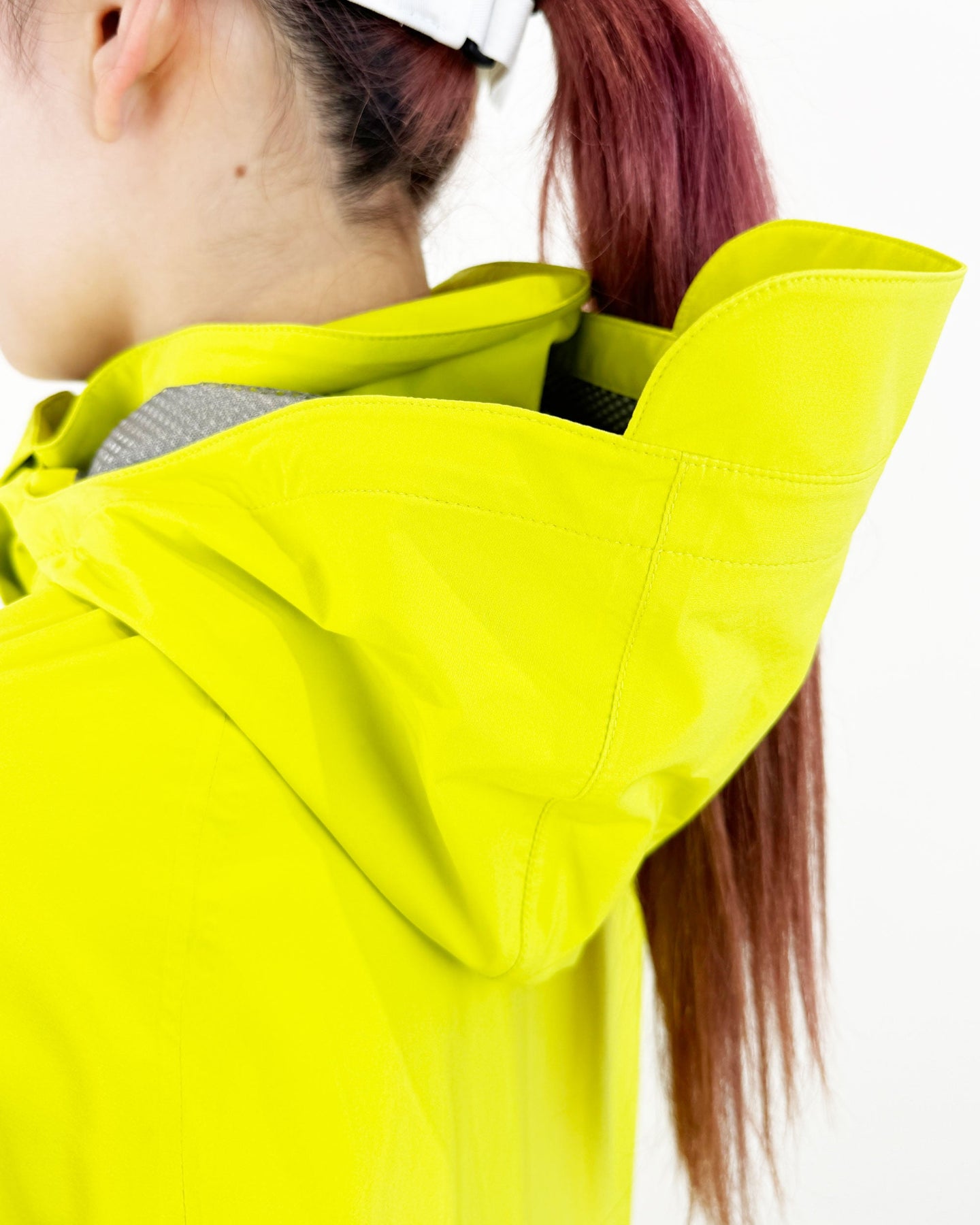 優れた防水性に、高い透湿性をプラスした特殊機能素材を使用したワンピースタイプのレインウェア。着用時のムレ感が少なく快適な着心地を実現。衿にフードが内蔵されています。ソフトな風合いとシルエットが美しいアイテム。メッシュの巾着付き。
