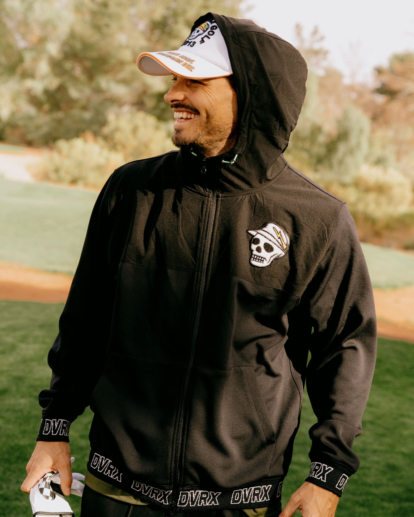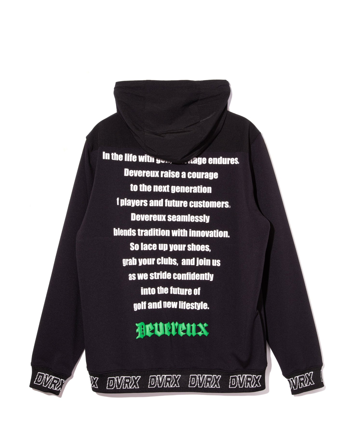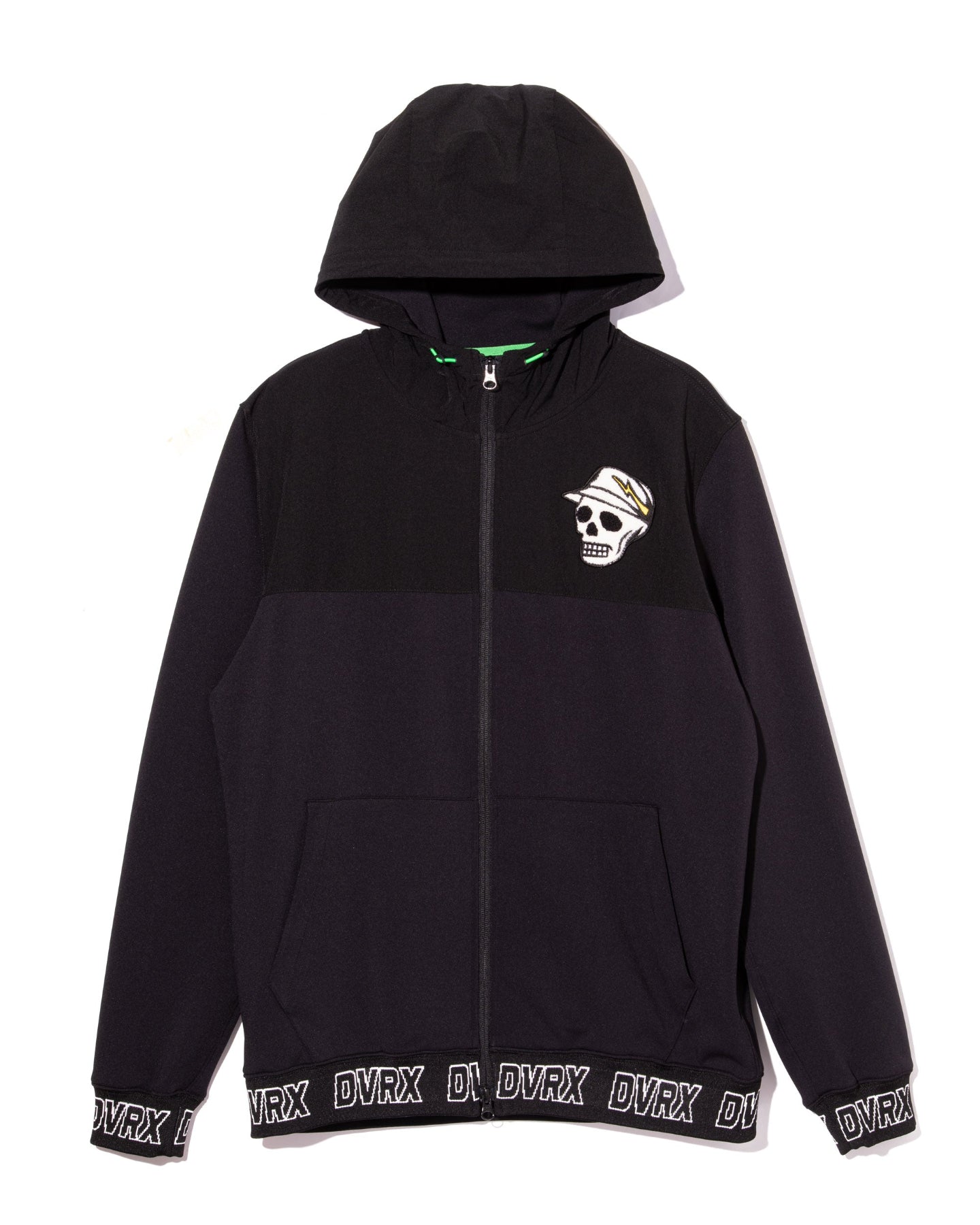 ボディーにポリエステルストレッチダンボール素材、別布でナイロンストレッチ素材を使用したフルジップフーディー。