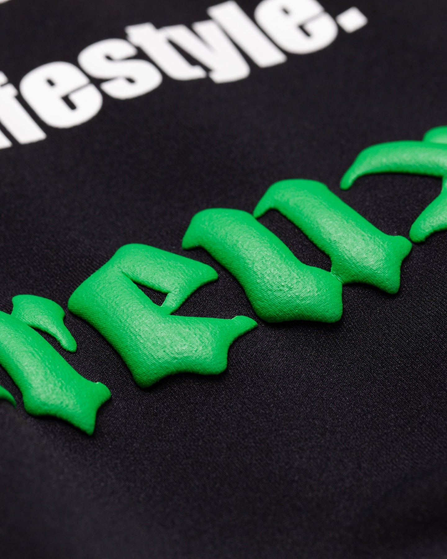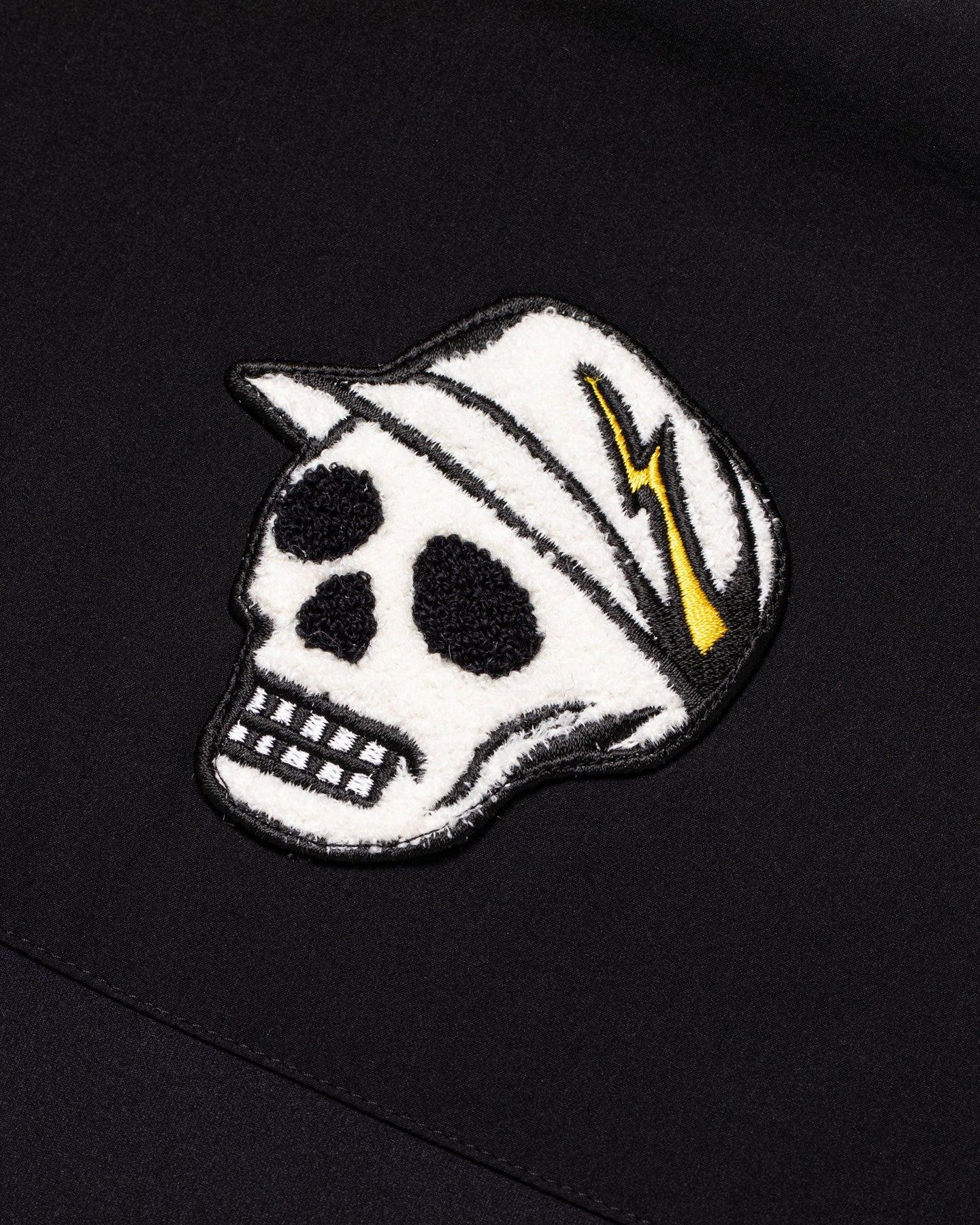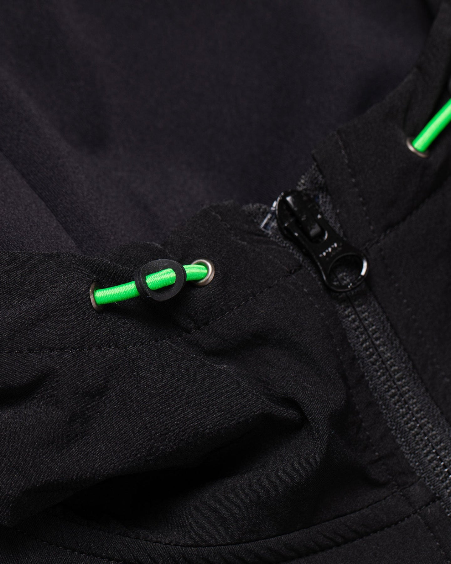 ボディーにポリエステルストレッチダンボール素材、別布でナイロンストレッチ素材を使用したフルジップフーディー。